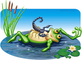 Una rana stava serenamente sguazzando in un fiume quando ad una sponda si avvicinò uno scorpione. "Devo passare dall'altra parte" disse "ma non so come fare, io non so nuotare e se provo affogherò. Tu potresti aiutarmi trasportandomi sul tuo dorso, te ne sarei molto grato". La rana perplessa rispose: "Ma se io ti lascio salire sul mio dorso tu potresti pungermi ed uccidermi!". Lo scorpione rassicurò la rana: "Non ti preoccupare, perchè dovrei farlo, se ti pungessi morirei anch'io perchè affogheremmo entrambi nel fondo". La rana si sentì rassicurata dalle spiegazioni dello scorpione e lo fece salire. Quando furono a metà del fiume, lo scorpione punse la rana. La rana stupita dal gesto dello scorpione mentre stava affondando insieme a lui trovò la forza di chiedergli: "Ma perchè l'hai fatto adesso moriremo entrambi?" Lo scorpione rispose "Non ho potuto farne a meno, sono uno scorpione ed e' questa la mia natura.
